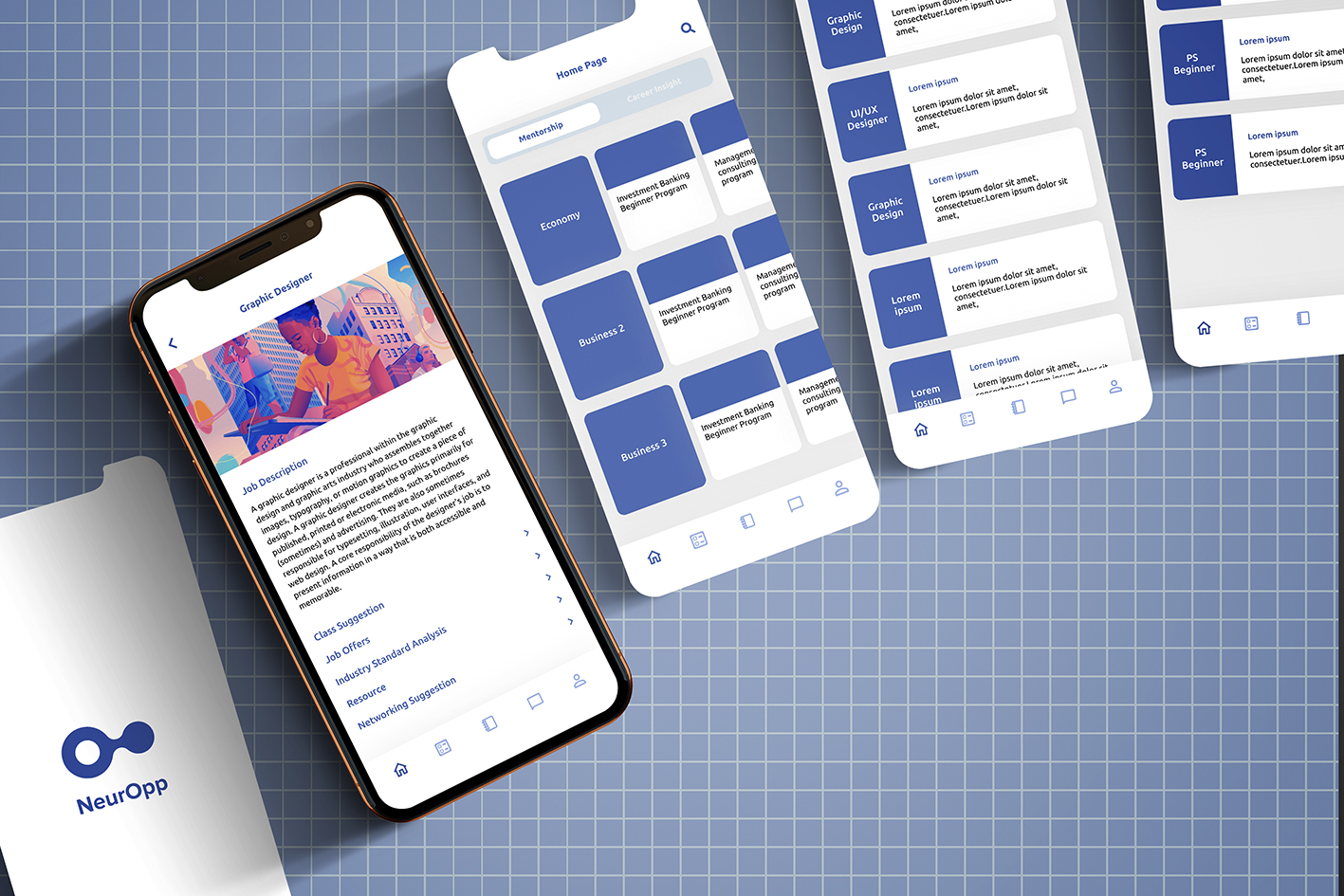 - Background: Created a job search platform (NeurOpp) that integrates jobs, school students, industry authorities, and university professors; - Brand design: According to the education brand positioning, designed minimal business cards, letter paper, paper bags and other peripherals to convey the brand style using blue, white and gray tones; - App design: Designed both the Chinese and English versions of mobile phone App interface, highlighting functional element design; connected with developers to realize the functions of dialogue with authorities, lecture participation, online and offline course learning, and professional network establishment; - Achievement: The app was successfully developed and available on App store;